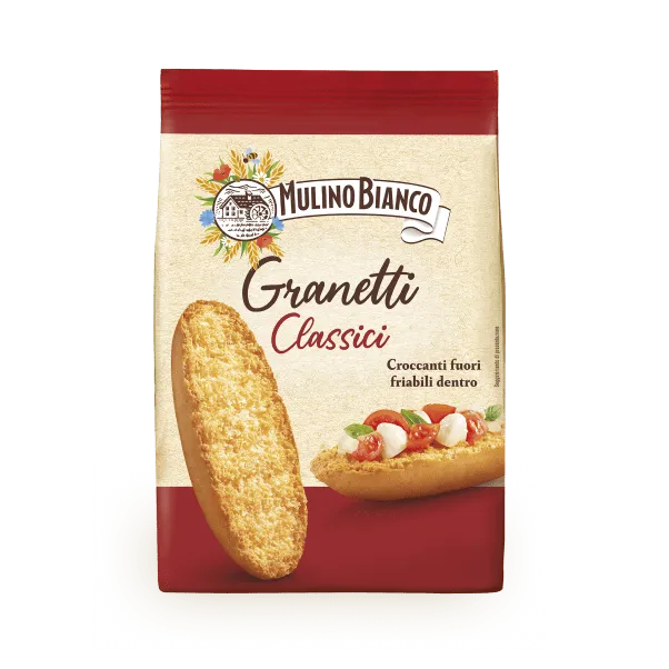 Paine Prajita Granetti Dorati Mulino Bianco 280gr – Crocanta la exterior si frageda in interior, este perfecta pentru a fi servita la masa ta, in locul painii.
