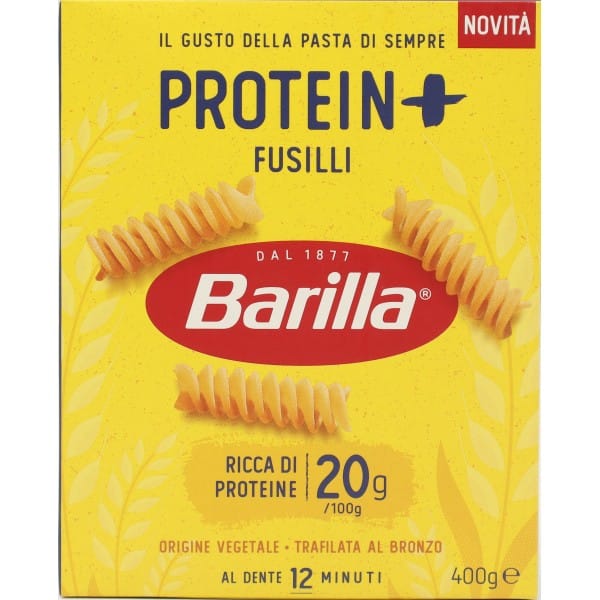 100 g de Barilla Protein+ conține aproximativ 40% din aportul proteic de referință al unui adult mediu (8400 kJ/2000 kcal).