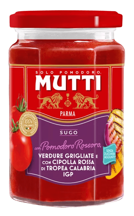 Ingrediente: Pulpa de rosii 57,2%, Piure de rosii “Rossoro” 20%, Concentrat de rosii 5%, Vinete la gratar 5%, “Cipolla Rossa Di Tropea Calabria I.G.P.” Ceapa 5%, ardei galbeni la gratar 4%, ulei de masline, arome, sare, oregano, usturoi, piper negru. Gramaj: 280g